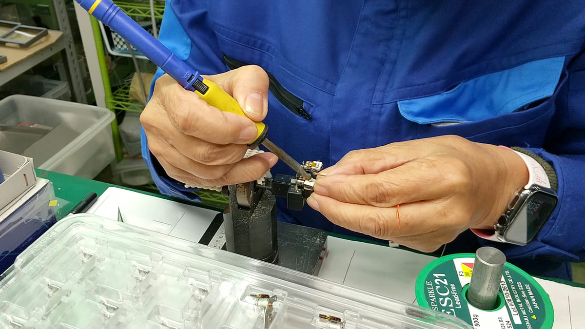 20mm程度の部品にはんだ付けや接着剤付け、微細な組み立てを行う光学職場。ここで勤続52年のMさんは、長年の経験と技術により品質と信頼を支えています。