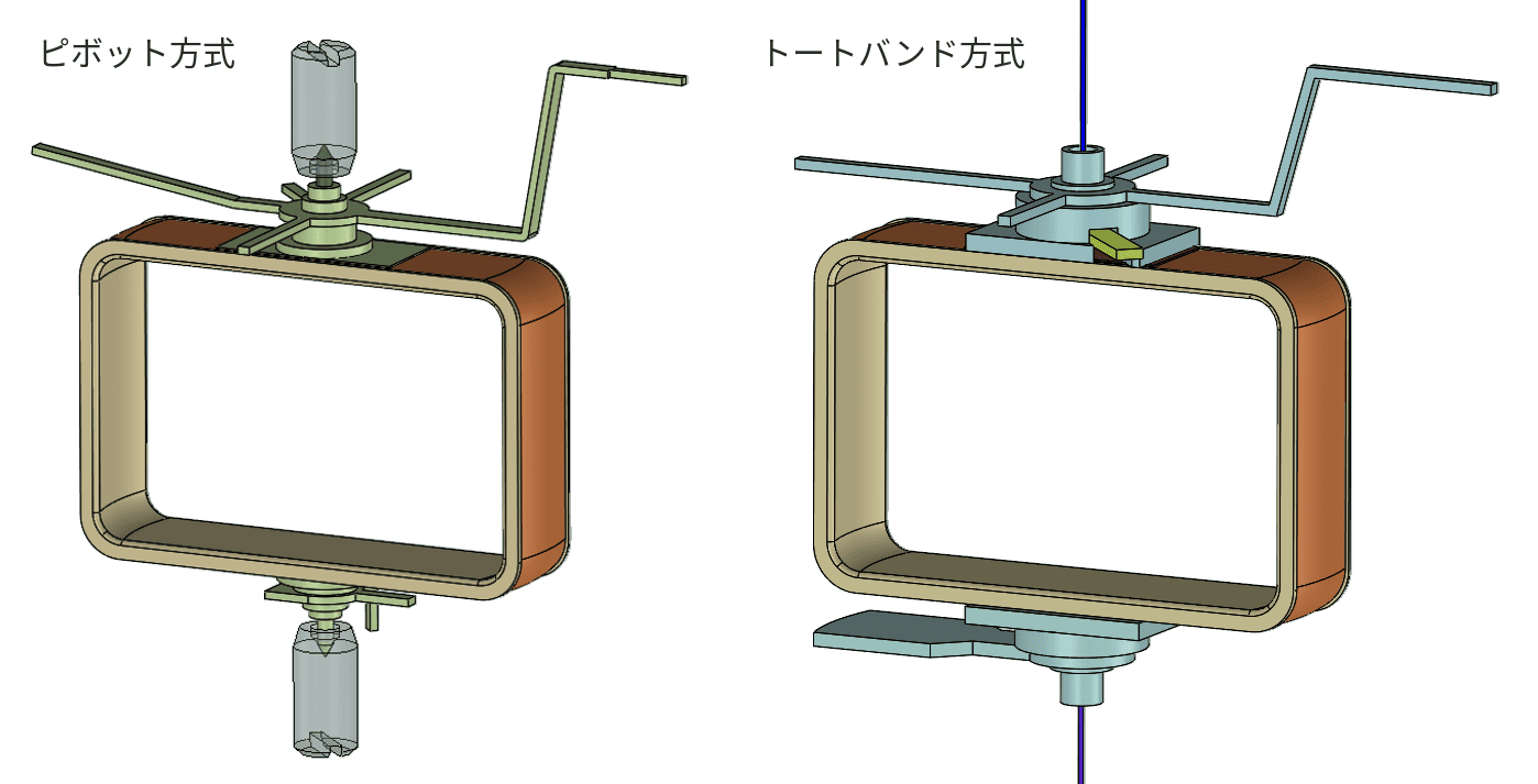 アナログメーターの代表的な方式として、「ピボット(Pivot)方式」と「トートバンド(Taut Band)方式」があります。