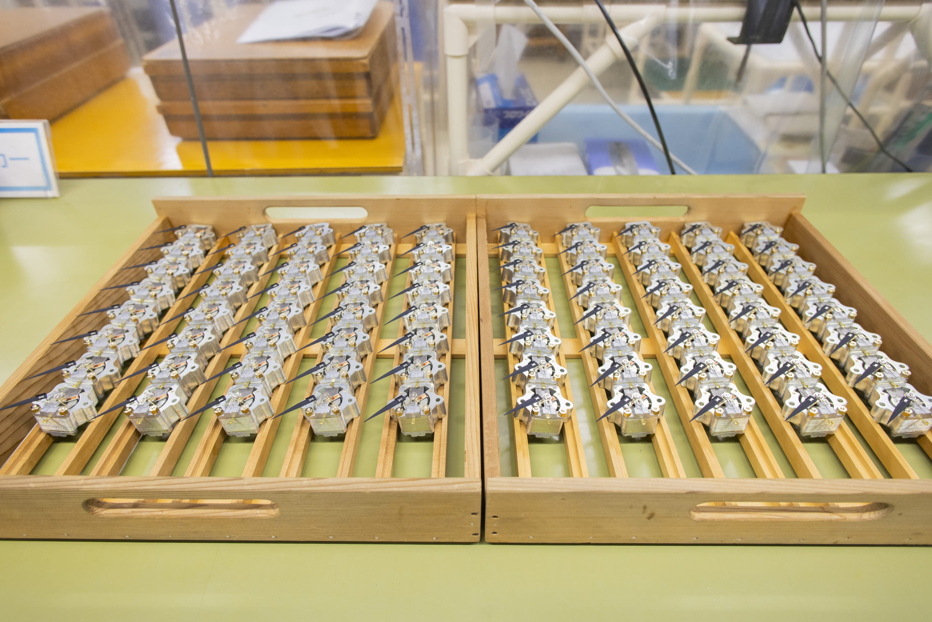 さらに、これらの部品を組み上げてアナログメーターの素子(当社では「内機」、海外では「ムーブメント(Movement)」と呼びます)を構成する工程には、高度な技能が必要となります。この工程では、微細なはんだ付けや部品のわずかな調整など、職人の経験や感覚に依存する部分も多く含まれています。こうした技能の習得には長い時間を要するため、人材育成は大きな課題である一方で、高い参入障壁にもなっています。